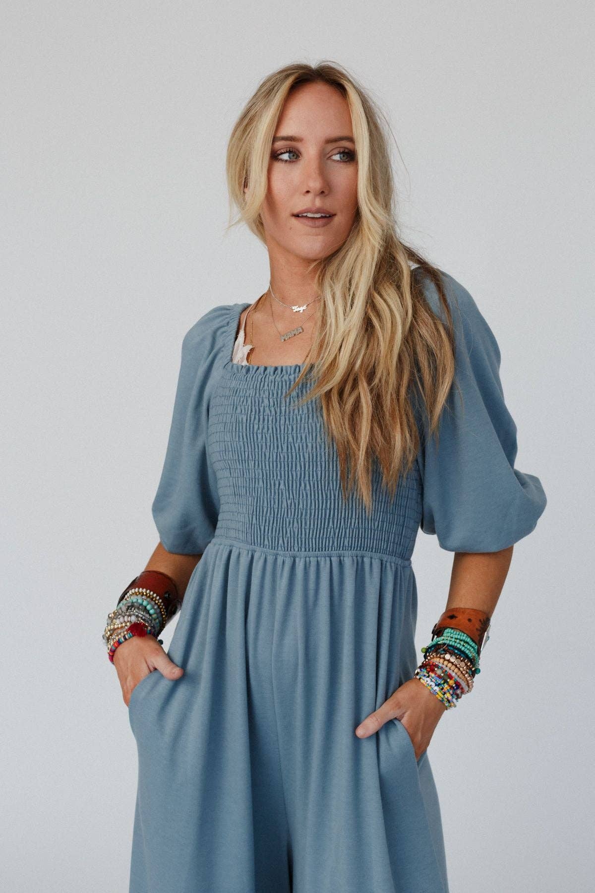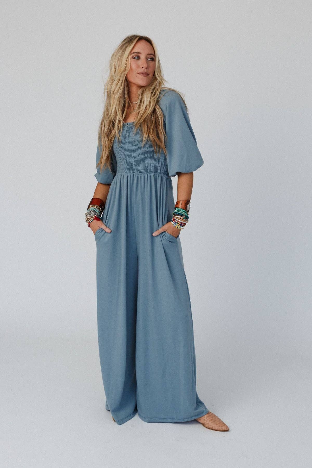 Nick Of Time Smocked Jumpsuit - Gunmetal