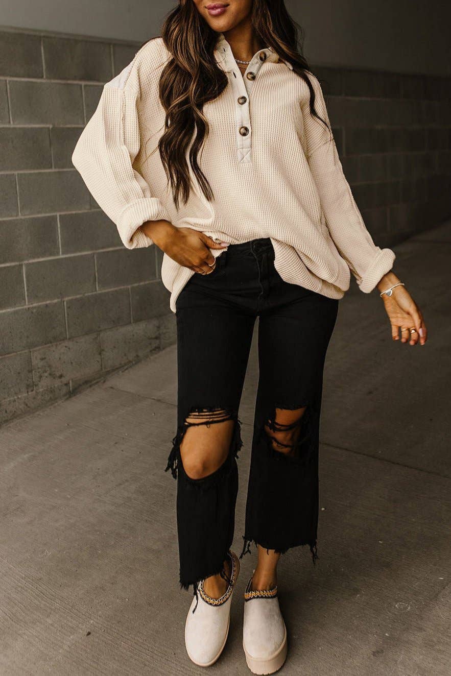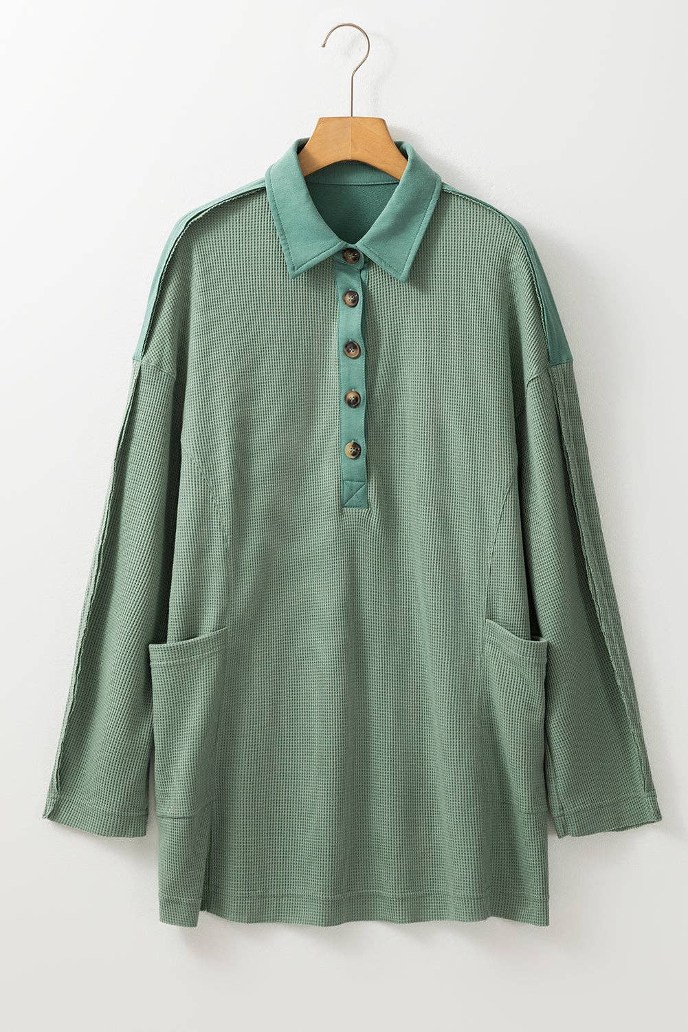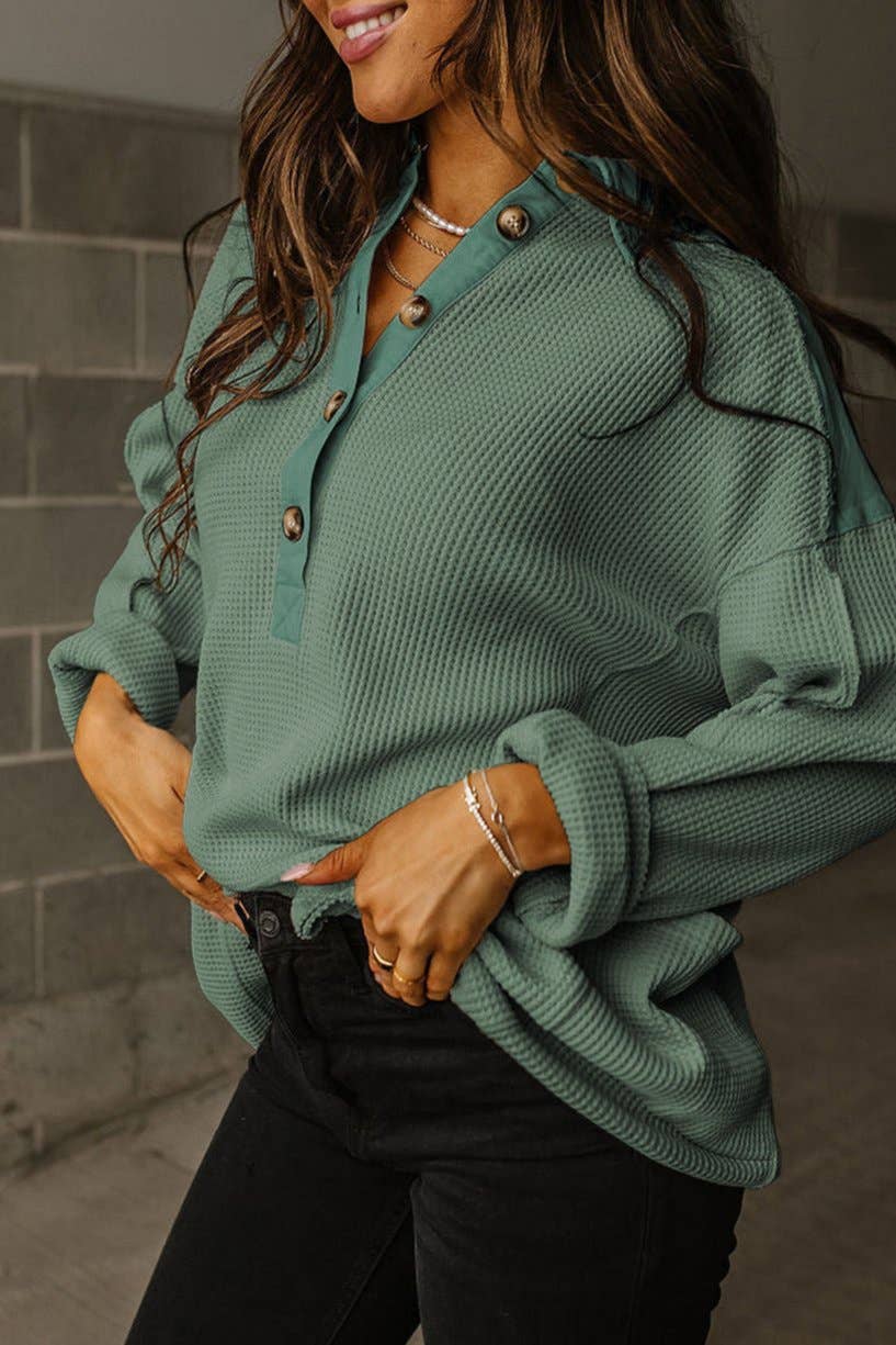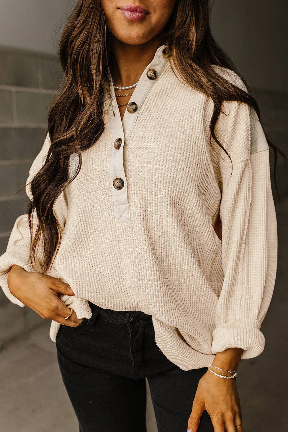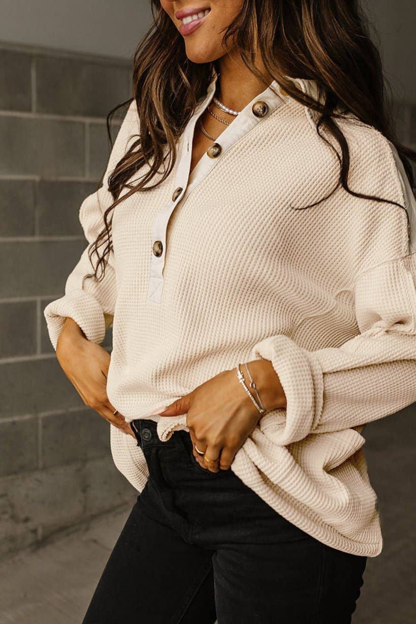 Stay cozy in all-day comfort with our button Loose Top. Made with premium waffle fabric, our loose-fit top is effortlessly chic with a collar and half-button design. Its versatile design makes it easy to pair with any bottom. Perfect for staying stylish and comfortable.