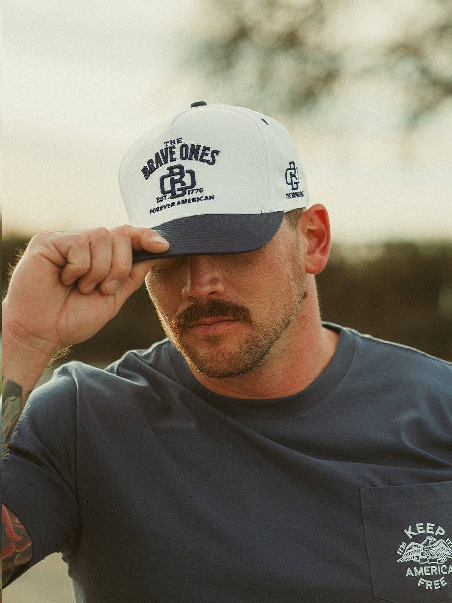 The Western Iron Logo Hat by The Brave Ones is a tribute to the hard-working American spirit that can’t be tamed. Featuring our bold "BR" insignia front and center like a cattle brand, this hat is built for cowboys, ranch hands, and freedom-loving patriots who carry on the legacy of the West. Crafted with a classic 5-panel mid-profile build and structured crown, this USA-made hat delivers all-day comfort whether you're working fence lines or cruising through town. The vintage cream crown and deep navy bill combine for a clean, rugged look that pairs just as well with denim and dust as it does with your favorite tee.